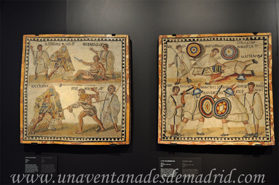 Entre los elementos expuestos relacionados con el anfiteatro, se encuentran dos mosaicos en donde se muestran distintas escenas de la lucha de gladiadores: en uno se representa la derrota de Kalencio, un retiario, por lo que sus armas eran red, tridente y puñal, a manos de Astynax, un secutor, por lo que portaba casco, escudo y espada; en el otro, se cuenta la lucha entre dos murmillones, que son aquel tipo de gladiadores armados con casco, escudo y espada recta (estos últimos característicos de los legionarios romanos), Simmachius y Maternus, con el resultado final de la derrota de este último.