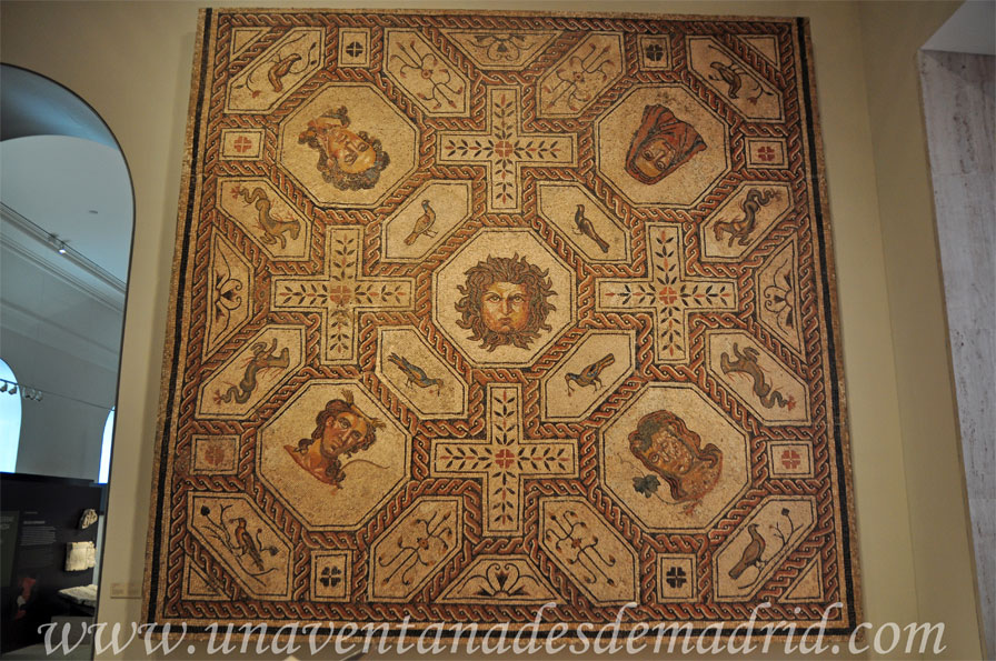 En la pared que separa esta sala de la siguiente, hay dos obras más. La que está más cerca de nosotros es un “Mosaico vegetal” y, al igual que los ya vistos, es de piedra caliza, siendo éste del siglo IV y habiendo sido hallado en Villa del Soto de Ramalete (Tudela, Navarra); este mosaico ornamentó el vestíbulo de una habitación destinada a la recepción en una villa rural y en él podemos contemplar motivos vegetales, guirnaldas que se entrelazan, ramos de flores y frutos, y un delfín, todo ello símbolo de la abundancia y fertilidad de la naturaleza como fuente de riqueza y de bienestar. Al fondo, está el “Mosaico de Medusa y las estaciones”, de igual material y misma datación que el anterior, y localizado en Palencia; en él, se ve en el centro la máscara de Medusa, mientras que los cuatro rostros de las esquinas representan las cuatro estaciones, rodeado todo ello de pájaros, leones marinos e hipocampos43 que hacen alusión a la fertilidad conforme al devenir del año, protegiendo y dando su bendición con su abundancia al señor.