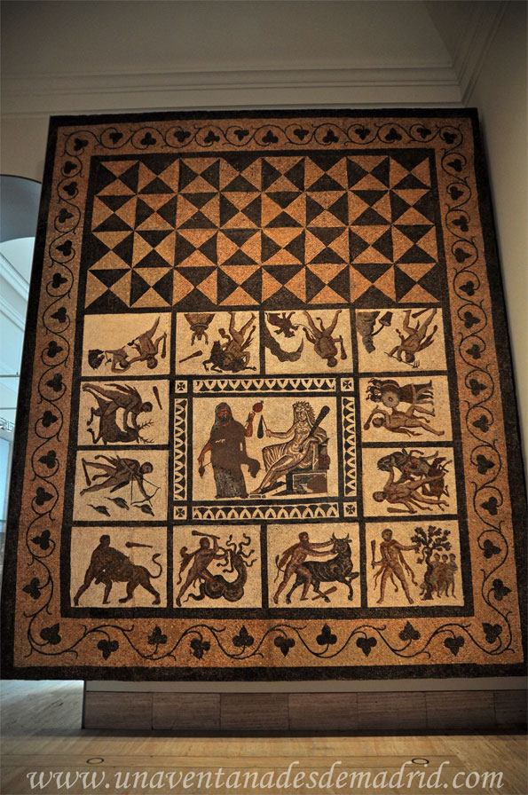 En el muro que queda tras nosotros al entrar en la sala, cuelgan otros dos. El de la derecha es un “Mosaico geométrico con anagrama” de piedra caliza datado del siglo IV y encontrado en las Cuevas de Soria (Soria); perteneció al triclinio de una lujosa villa propiedad de un miembro de la aristocracia rural que tuvo hasta veinte habitaciones pavimentadas con mosaicos; el nombre de su dueño se halla en el anagrama que hay en el centro. Por su parte, el de la izquierda es el “Mosaico de los trabajos de Hércules”, del mismo material que los anteriores, perteneciente al siglo III y encontrado en Liria (Valencia); ejemplo de las virtudes de los nobles romanos, los trabajos de Hércules son transmitidos por medio de las imágenes y de la literatura, por lo que tener un mosaico con esta temática indica la erudición de su propietario.