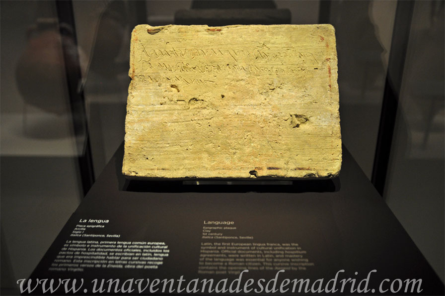 Por otro lado, se impondrá el latín, convirtiéndose en la primera lengua común europea y en un instrumento y un símbolo de la unidad cultural de Hispania; todos los documentos oficiales serían escritos, pues, en latín y habría que dominar la lengua si se quería ser ciudadano romano; en la sala, veremos una placa de arcilla del siglo I con una inscripción en letras cursivas en la que se pueden leer los primeros versos de la “Eneida”, de Virgilio.
