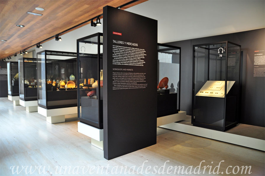 En la Sala 19, comenzamos la visita por la sección dedicada a Talleres y Mercados, en donde a través de seis vitrinas dedicadas a la moneda, la cerámica, el vidrio, el bronce y el oro y piedras preciosas, se muestran productos fruto de la artesanía urbana de las ciudades hispanorromanas.