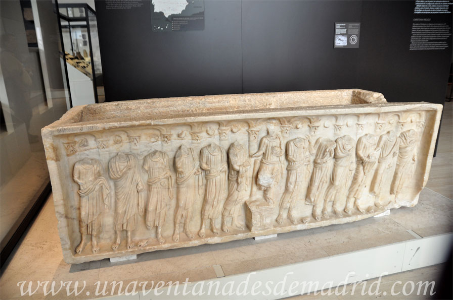 Sarcófago hallado en La Pueblanueva, en Toledo, con las imágenes de Cristo y de los doce apóstoles talladas y que sirve de muestra de la cristianización de la aristocracia rural. Siglo IV.