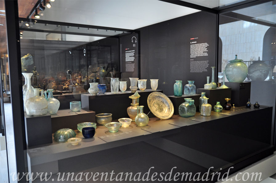 La vitrina por la que pasamos ahora es la dedicada al vidrio, en la que se exponen diversos objetos hallados en distintos yacimientos arqueológicos.