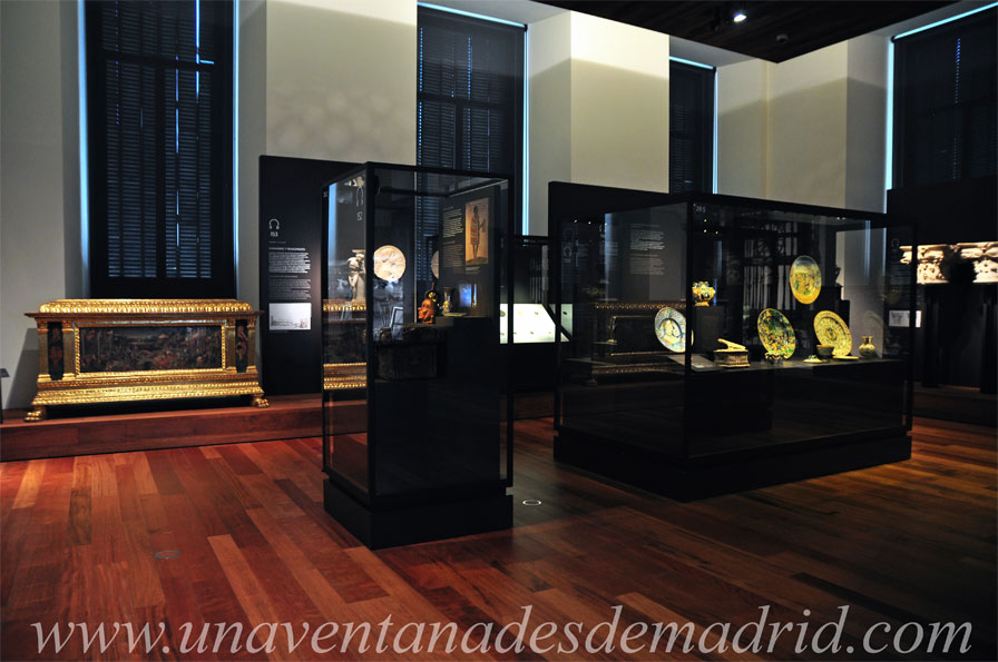La sala se completa con un arca de la escuela aragonesa realizada en madera de nogal a principios del siglo XVI con lacerías mudéjares y herrajes góticos; una silla de doble tijera, plegable, hecha en el siglo XV en madera, hueso y cuero procedente de Burgos y decorada con taracea110; y un armario de pino policromado interior y exteriormente de finales del XV, originario del Convento de Santa Úrsula (Toledo) y de gran tamaño, lo cual hace pensar que quizás sirvió para guardar telas o ropas.