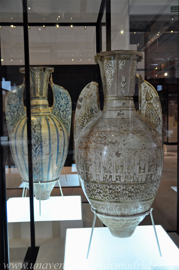 Varias son las piezas realizadas en época nazarí que veremos en este apartado de la sala en que nos encontramos. Relacionadas con la cerámica, tenemos jarrones tipo Alhambra como los de la fotografía que acompaña este texto, azulejos empleados en revestimientos de muros, jarras y otros recipientes pintados y vidriados con un carácter popular que se decoraban con motivos vegetales y epigráficos. Málaga sería el principal centro de producción de la loza dorada nazarí, de la cual una importante parte estaba destinada a su exportación, pues era muy apreciada en el mundo occidental, donde se llamaba opera de Malica. La técnica empleada se basaba en tres cochuras48: las dos primeras, con fuego oxidante, servían para fijar la forma y la decoración, mientras que la tercera y última era por medio de fuego reductor, que se empleaba para dar el dorado, el cual se conseguía dando una solución de cobre y mercurio a la ornamentación. También era frecuente emplear el azul cobalto.