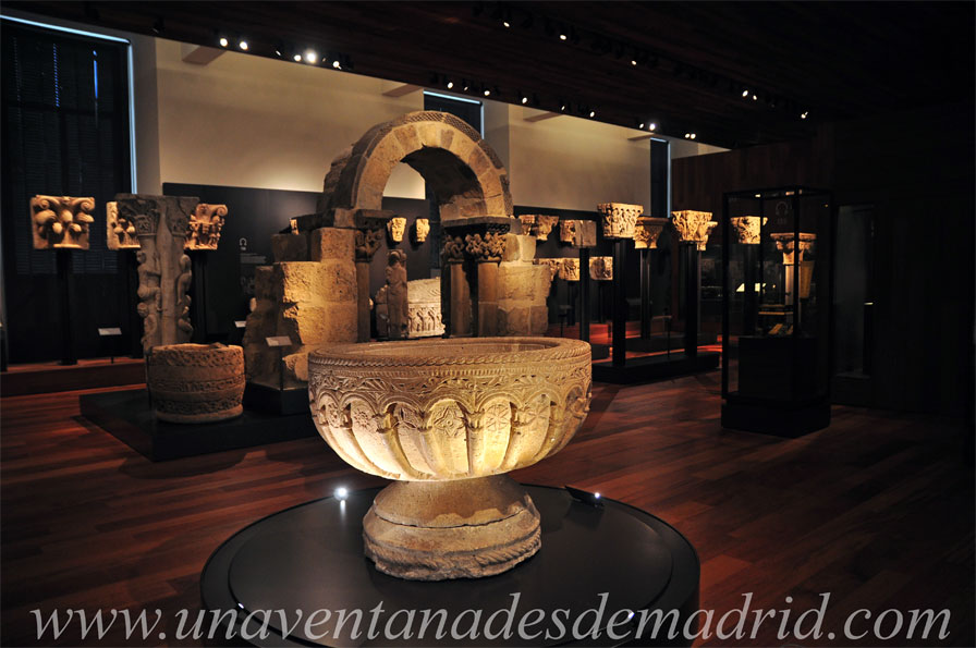 Las construcciones en los reinos cristianos estuvo muy centralizada en los monasterios, una buena parte de los cuales se encontraban situados en el Camino de Santiago, en lugares estratégicos, con el abastecimiento de agua asegurado y constituyendo, conforme a la regla de San Benito, un microcosmos autosuficiente. La iglesia de estos recintos solía seguir unos determinados parámetros similares: planta rectangular, tres naves y tres ábsides122. Entre los elementos expuestos procedentes de distintos cenobios124, destacan, en la anterior sala 23, la portada románica del Monasterio de San Pedro de Arlanza (Hortigüela, Burgos), de la que ya hablamos al tratar dicha sala, y, en ésta, el arco románico del Monasterio de San Pedro de las Dueñas, de la localidad leonesa de igual nombre.