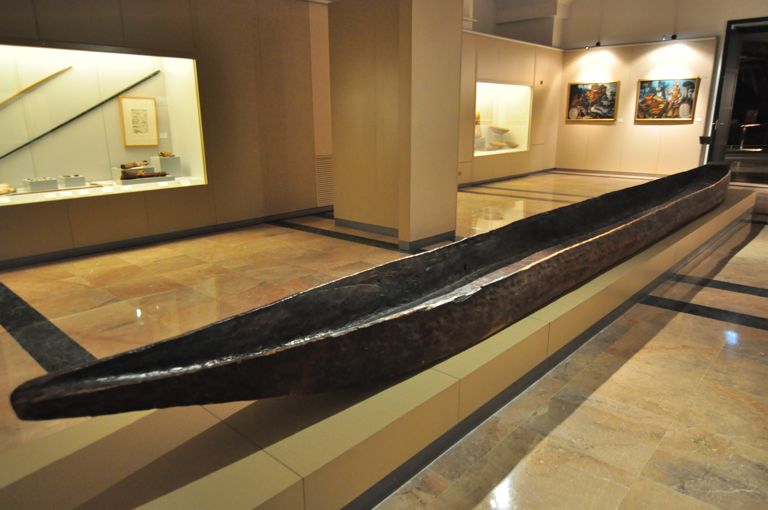 Y en las numerosas vitrinas dedicadas a las bandas encontraremos objetos relacionados con la vida diaria de estas sociedades. Por un lado, veremos algunos de los trabajos que realizan y las herramientas utilizadas para ello, como pueden ser el curtido21 de pieles y diversas piezas de cestería22 en las que se han usado distintas técnicas; todo ello nos muestra las diferentes labores para transformar las materias primas. Asimismo, también veremos sus principales armas de caza, como por ejemplo arpones. Pero sin duda, uno de los elementos que más llamará nuestra atención será la Canoa que se expone en mitad de una de las salas. Realizada en madera en el siglo XIX, fue conseguida por los integrantes de la Expedición Científica al Pacífico gracias al intercambio de tejidos con los indígenas; así, los componentes de dicha expedición que sobrevivieron a la campaña la pudieron usar para navegar las aguas del río Amazonas y ponerse a salvo.