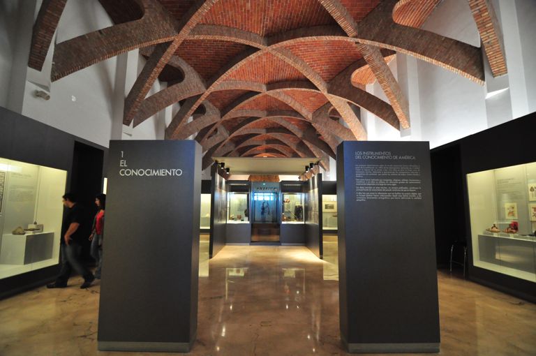 De este modo, en la primera sala se nos muestran Los Instrumentos del Conocimiento de América que, durante todo este tiempo, han contribuido a crear en nosotros la imagen que tenemos del continente. Ejemplo de ello son las numerosas descripciones que de América han hecho diferentes cronistas y que podremos leer en los paneles que se distribuyen en las primeras vitrinas a ambos lados de la sala. Los primeros relatos sobre América datan de un año después de su descubrimiento, en 1493, de la mano del propio Cristóbal Colón a su regreso a la península.