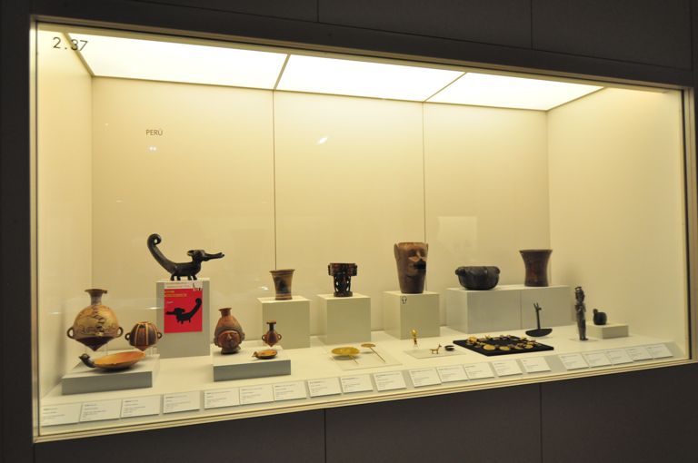 En la imagen, podemos ver, en primer lugar, el expositor en el que se nos presentan elementos procedentes de Colombia (entre otros, diversos objetos del Período de Integración de las Culturas Quimbaya, Sinú y Tairona). La vitrina que vemos al fondo, a la derecha, es también del Área Intermedia, en este caso de Ecuador.