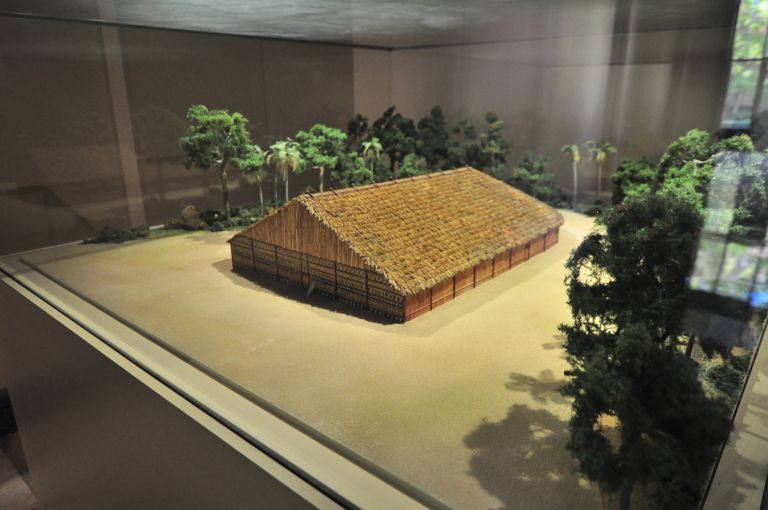 Por último, veremos una maqueta de una Maloca. Se trata de un espacio comunal típico en la Amazonía donde viven varias familias que pertenecen a un mismo clan. Para su construcción, el principal factor a tener en cuenta es el curso que sigue el río. De planta rectangular y techo a dos aguas, la parte trasera suele tener forma redondeada; asimismo, cuenta con dos puertas. En cuanto a su interior, no existen las separaciones, de tal modo que la organización se hace en función del estatus de cada familia: las de mayor estatus se ubican en la zona central y en la más cercana a la entrada, mientras que las demás se colocan en la mitad posterior, dejando reservado un espacio para visitantes de otros clanes.