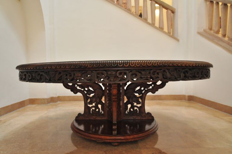 Pero antes de subir, nos detendremos unos instantes para observar la gran Mesa (su tablero mide más de 2 metros de diámetro) que acompaña estas líneas. Realizada en madera, está fechada en el siglo XIX y procede de Filipinas.