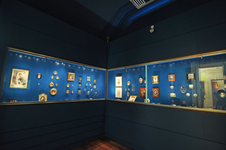 Como hemos mencionado, aquí tenemos hasta tres tipos de objetos cuya característica común es su reducido tamaño. Por un lado, están las miniaturas, género pictórico en el que se usa el temple4, o la gouache5, sobre papel, pergamino y láminas de marfil. Los mínimos puntos de color son insertados en la superficie por finos pinceles, de tal modo que, si se mira a cierta distancia, se aprecia una uniformidad en los tonos y un acabado fundido y perfecto. Tuvieron su mayor fama en la Europa de los siglos XVIII y XIX, siendo usadas del mismo modo que los pequeños retratos, que veremos también aquí. En esta sala, hay una muestra de la escuela francesa, con obras de Dumont, Hesse, o Grandchamp, entre otros; de la inglesa, tenemos miniaturas de autores como Singleton, Grimaldi, o Cosway, por citar a algunos; de la escuela italiana, están el retrato de Rousseau, de la milanesa Julia Corneo, y otras obras de Guglielmi; de la austriaca, destacan Füger, o Goebel. En lo que concierne a la escuela española, ésta está representada en este gabinete a través de las obras de artistas como Cruz y Ríos, Ferrán, Rostán, o Tomasich, entre otros.
