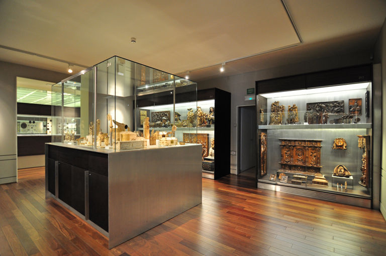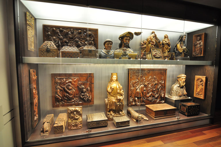 En segundo lugar, están los objetos hechos de madera, especialmente aquellos destinados al arte suntuario, como varios bajorrelieves que destacan por la belleza de las tallas datados entre los siglos XV y XIX, pequeñas piezas de mobiliario, esculturas, etc. Cabe mencionar que, a pesar de que la mayoría de los objetos son originales, la colección también cuenta con algunas reproducciones de estilo historicista13. Asimismo, también se pueden distinguir entre algunas obras procedentes de escuelas extranjeras y otras realizadas en la escuela española.