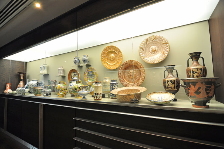 Por otra parte, está la colección de cerámica, que, al igual que la anterior, cuenta con originales e imitaciones de otros modelos, como ánforas griegas, mayólicas19 italianas, lozas y cerámicas de Teruel, Cataluña, Talavera y Alcora. Asimismo, también hay algunas piezas de cerámica islámica y oriental. Si abrimos los cajones, podremos ver un alicatado20 granadino y una selección de azulejos hechos en Toledo, Sevilla y Valencia.