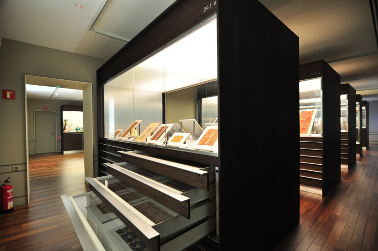 En la sala, el conjunto se ha organizado, o agrupado, según los distintos centros de producción textil que ha habido a lo largo de los siglos. De todo ello, sobresalen las sedas hispanomusulmanas y las del Mediterráneo Oriental; algunas piezas de Persia, China y Japón; y las telas europeas de los siglos XV y XVI. Igualmente, destaca una colección de textiles de la época de los Reyes Católicos, como terciopelos italo-españoles y sedas nazaríes. De este período, merecen nuestra atención un terciopelo con los escudos de Felipe "el Hermoso" y Juana I, el llamado "Capillo del Príncipe Don Juan" y la denominada "Casulla del Cardenal Cisneros".