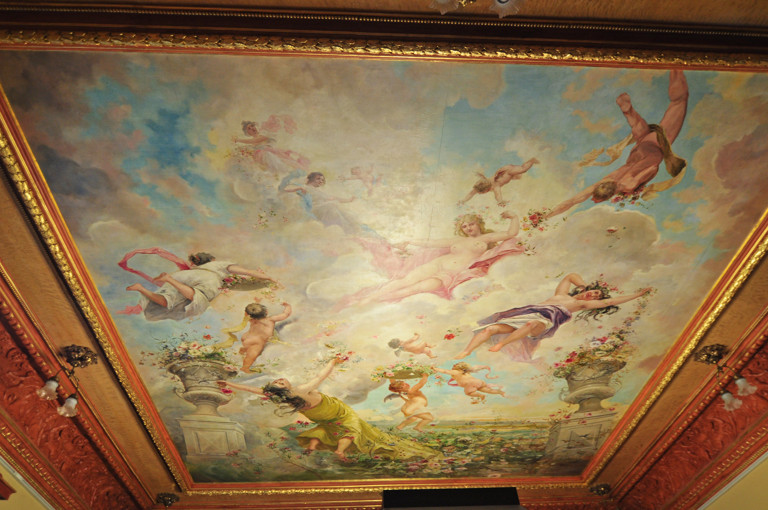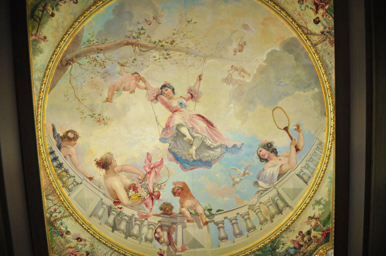 Antes de seguir, miraremos el techo del que fuera Salón de Billar de la casa, donde Lucas Villamil pintó diversas escenas de juegos y diversiones de niños.