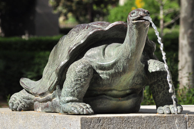 En la foto de inicio, observamos a la iguana sobre el pedestal derecho y al galápago sobre el izquierdo, algo que se repite al otro lado de la fuente. Las imágenes que aquí mostramos corresponden a primeros planos de los dos ejemplares situados en la cara Este de la monumento.