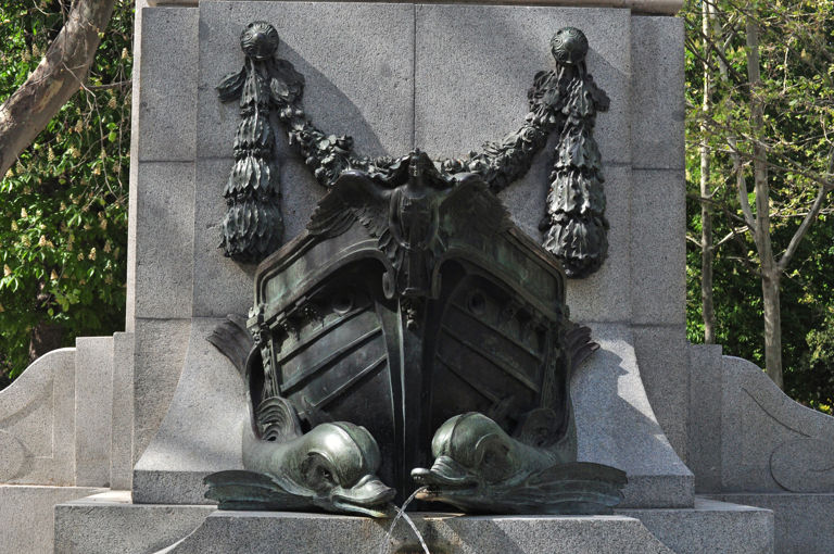 En el primer cuerpo, reparamos en cada lateral de menor tamaño, los situados al Norte y al Sur, y de los que asoma la proa de una carabela5 con un mascarón10 formado por un ángel que porta una cruz. La embarcación aparece apoyada sobre dos surtidores de agua con forma de delfín y bajo una guirnalda confeccionada con los productos típicos de la agricultura cubana, como si de una corona de laurel se tratase, recordando la gran riqueza que ésta significó para España. Las figuras de bronce son un producto de las manos del escultor Mariano Benlliure y Gil (Valencia, 8 de septiembre de 1862 - Madrid, 9 de noviembre de 1947), pudiendo considerarse todo el conjunto formado por éstas y el primer cuerpo de piedra como una columna rostral13 romana n la que se nos representa la celebración del triunfo de las naves colombinas al lograr atravesar el Océano Atlántico y llegar hasta las costas cubanas, sin olvidar la importancia del proceso de evangelización que, en ocasiones, dirigió la conquista de América.
