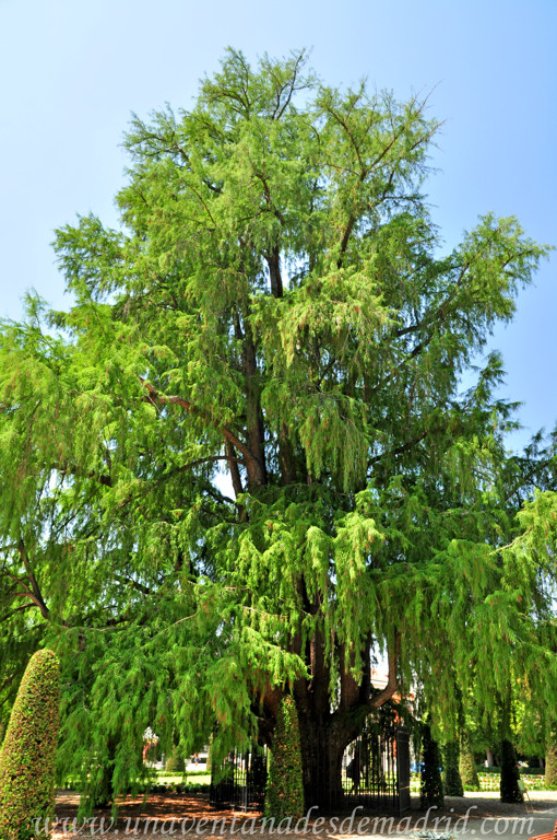 El siguiente árbol, situado al lado del muro izquierdo de cerramiento del Parterre, cerca de una de las Fuentes de la Alcachofa ahí situada, es un Ahuehuete (Taxodium mucronatum Ten), número 8 en la senda, cuyo origen encontramos en México. Son especies muy longevas, llegando a existir en su país originario algunos ejemplares con entre 2.000 y 6.000 años de antigüedad. Lo más llamativo es las numerosas ramificaciones en que se divide su tronco, tomando así la apariencia de un candelabro. Éste que aquí encontramos es el único ejemplar de ahuehuete que hay en El Retiro, además de no haber conocimiento de que exista otro en la ciudad de Madrid, lo que lo hace aún más especial. De este modo, fue incluido en el Catálogo de Árboles Singulares de la Comunidad de Madrid por el decreto 18/92 del 26 de marzo de 1992. Numerosas son las leyendas que hay en torno a este árbol, comenzando por que se cree que fue plantado durante la creación del Sitio del Buen Retiro, hacia el año 1632, lo que lo convertiría en el árbol más antiguo de Madrid; sin embargo, en la localidad madrileña de Aranjuez hay ahuehuetes datados del siglo XVIII con mayor altura y anchura que éste, por lo que el de El Retiro pudo ser plantado, en realidad, hacia el siglo XIX. Más leyendas, incluso la que atribuye que es un descendiente de un ahuehuete relacionado con Hernán Cortés, y más características se pueden encontrar en el artículo que tiene dedicado dentro del reportaje de la Senda 1, o entrando directamente en este enlace.
