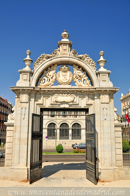 Concentrémonos en el hueco central. Éste está formado por dos cuerpos: uno bajo, o de acceso, entre pilastras, adintelado y con molduras quebradas; y otro superior, un arco de medio punto que corona el conjunto con un tímpano7 de molduras y dos escudos con la Corona Real, uno a cada lado, siendo el de Madrid el que queda en la cara del jardín, rodeado con una guirnalda, y el de España el que da a la Calle Alfonso XII, éste último rodeado por el toisón de oro y su cordón. Es aquí, bajo el escudo de España y sobre el dintel, donde vemos una cartela9 ovalada con una guirnalda en la que reza la siguiente inscripción:
