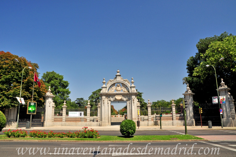 Originalmente, esta puerta estaba ubicada en lo que en la actualidad es la Plaza de Cánovas del Castillo, lugar donde vemos la Fuente de Neptuno, ya que en el momento de su construcción el Jardín del Buen Retiro llegaba hasta esa zona. Más adelante, a mediados del siglo XIX y con motivo de la urbanización de parte de los terrenos del parque, serviría de portada de la Ermita de San Juan, hoy desaparecida y entonces adosada al antiguo Palacio (en su solar hoy encontramos el Palacio de Telecomunicaciones, sede del Ayuntamiento de Madrid). Finalmente, será en 1922 cuando se traslade hasta su ubicación actual de la mano del arquitecto Luis Bellido, terminando las puertas y la verja de todo el jardín con la colaboración de José Urioste.