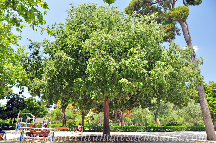 El último árbol que veremos en esta zona, pero ya fuera del Jardín de Vivaces, se encuentra en uno de los jardines cercanos, a pocos metros de donde estamos. Se trata del Almez (Celtis australis), con el número 36 y originario de la región mediterránea. Puede medir hasta 20 metros de alto y su base es ancha, con una forma que se asemeja a una pata de elefante y que es más pronunciada cuanto más años cumple. Su porte y su copa frondosa, así como su resistencia y su longevidad (puede vivir hasta 600 años), han hecho del almez que sea un árbol cuyo uso principal desde el siglo XVII es el ornamental. Sus frutos, las almecinas, son pequeñas y verdes al inicio de haber germinado, y negras ya en otoño, cuando maduran, siendo comestibles tanto para los pájaros como para las personas, pues son ricas en vitamina C, hierro y potasio; además, su característico sabor dulce las hace ideales para la producción de mermeladas y vinos dulces. De sus semillas se extrae aceite, mientras que sus raíces dan una sustancia que se emplea como colorante amarillo para teñir seda. En el parque, podemos encontrar varios ejemplares repartidos en distintas zonas aparte de éste, abundando especialmente en el Jardín de los Planteles. Sus características completas están en su artículo correspondiente dentro del reportaje sobre la Senda 3, o entrando en este enlace.