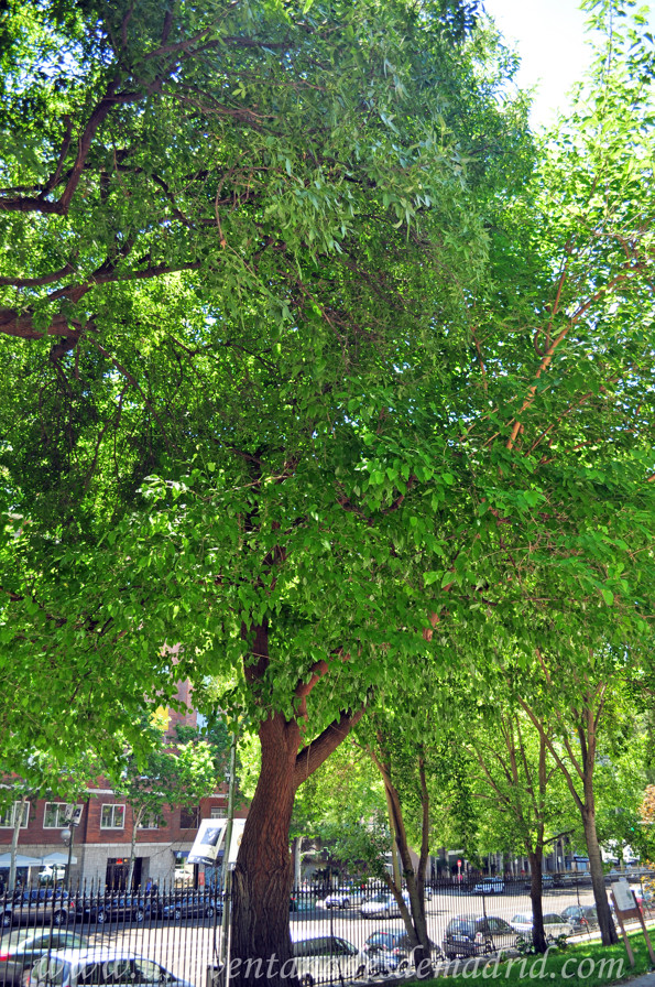 El primero será el Ciruelo de Pissard (Prunus cerasifera), número 26 en la senda y también conocido como ciruelo rojo, cerezo de Pissard, o ciruelo de Japón. Procedente del área del Cáucaso y del Oeste de Asia, debemos su introducción en Francia, a finales del siglo XIX, a Monsieur Pissard, jardinero del Sha de Persia, extendiéndose fácilmente por toda Europa su uso en jardinería gracias a su adaptabilidad a los diferentes climas. Llega a medir hasta 8 metros de altura y posee una copa de hasta 4 metros de diámetro. Su principal característica es ese color púrpura de sus hojas. En cuanto al fruto, éste germina en verano, siendo rojo oscuro, de sabor dulce y con forma similar a las ciruelas o las cerezas, y se utiliza para elaborar mermeladas. En El Retiro, hallamos este ejemplar aquí, en la zona del Campo Grande, en los Jardines de Cecilio Rodríguez y al Norte del Parterre. Para conocer las características completas de estos árboles, podéis leer el artículo publicado sobre ellos en el reportaje sobre la Senda 3, o siguiendo este enlace.