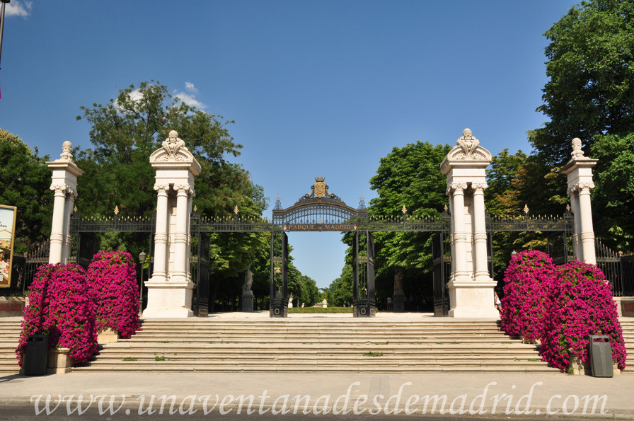 La entrada, que enlaza el Paseo de la Argentina (o de los Reyes), dentro del parque, y la Calle Antonio Maura, tras cruzar Alfonso XII, mantiene una composición similar con la Puerta de la Independencia, con la particularidad de que en ésta las columnas no son de orden dórico, sino jónico , y posee una mayor decoración tallada. Queda organizada con tres huecos, todos ellos cerrados por una verja y siendo el del centro más amplio, y con cuatro pilares ricamente ornamentados de fábrica mixta: ladrillo para el interior y piedra para el exterior. Los dos pilares centrales cuentan con basamento, dobles columnas jónicas exentas en el lado que mira a la calle y pilastras iguales en la parte que da al parque sobre fondo almohadillado , entablamento y frontón semicircular; de estilo completamente ecléctico , tiene molduras hacia la mitad del fuste, así como frontones coronados por piñas. El hueco central está cerrado por tres puertas dobles de forja, siendo la intermedia más alta y estando rematada por un arco con el escudo de Madrid realizado en bronce; en el dintel podemos leer en una cartela "PARQUE DE MADRID". En cuanto a los pilares laterales, éstos son más sencillos que los anteriores y constan de una columna jónica hacia el exterior y un pilar en el trasdós en el lado que mira al Retiro; quedan, asimismo, coronados por un tejado a cuatro aguas y dos piñas. El acceso a ambos lados de esta entrada está formado por dobles puertas metálicas.