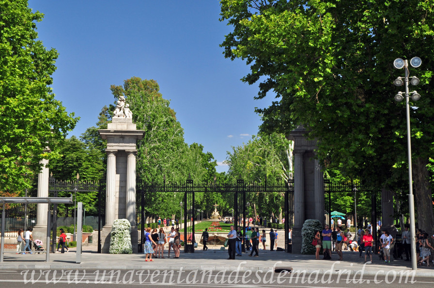 Comenzaremos nuestro recorrido en la Puerta de la Independencia, una de las más concurridas por estar, además, frente a la emblemática Puerta de Alcalá. Su autor, entre 1885 y 1886, fue José Urioste y Velada, si bien su origen lo debemos buscar varias décadas antes, en el año 1817, cuando el Ayuntamiento de Madrid compra el antiguo Casino de la Reina, en la Calle de Embajadores, para regalárselo a la segunda esposa del rey Fernando VII, la reina Isabel de Braganza. Así, en 1885, los pilares de la puerta de dicha edificación fueron trasladados al lugar que hoy ocupan y colocados por el arquitecto en el centro de la composición de la Puerta de la Independencia, mientras que para los laterales creó otros de trazas más sencillas; todo ello estaría unido por una verja de hierro, finalizando las obras el contratista Evaristo Vidal en 1886.