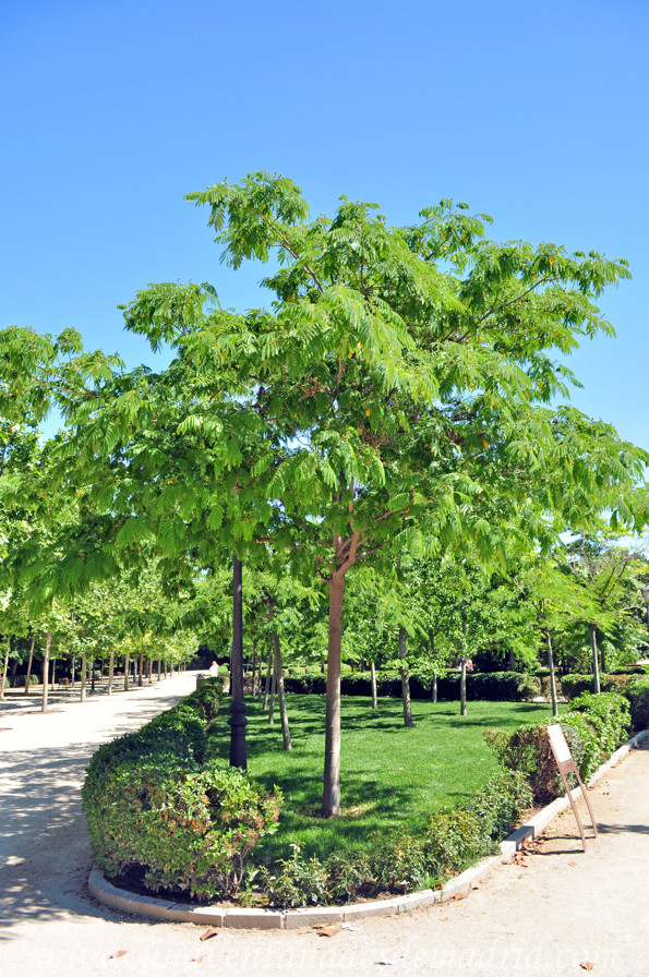 Más adelante, está la Acacia de Constantinopla (Albizia julibrissin), con el número 13, un árbol que procede de las zonas más cálidas y templadas de Asia y que fue introducido en Europa en el año 1745. Su buena adaptación al clima de Madrid se debe a que se trata de una especie que soporta muy bien las bajas temperaturas de hasta -30ºC, mientras que en verano necesita mucho calor. De no demasiada altura, ésta se mantiene entre los 4 y los 12 metros, siendo su tronco delgado y extendiéndose las ramas hasta formar una especie de sombrilla con la copa. Por las noches, así como durante las lluvias, sus hojas se cierran, lo que ha hecho que en Persia se le conozca como "shabkhosb", que en nuestro idioma quiere decir "durmiente de noche". Prácticamente todas las acacias de Constantinopla que hallaremos en el parque están en esta zona del Bosque del Recuerdo, aunque también hay algunos ejemplares cerca de la Calle Alfonso XII, entre la Puerta de la Independencia y la Puerta de España. Para conocer más acerca de estos árboles, podéis leer el artículo correspondiente publicado en el reportaje sobre la Senda 2, o siguiendo este enlace.