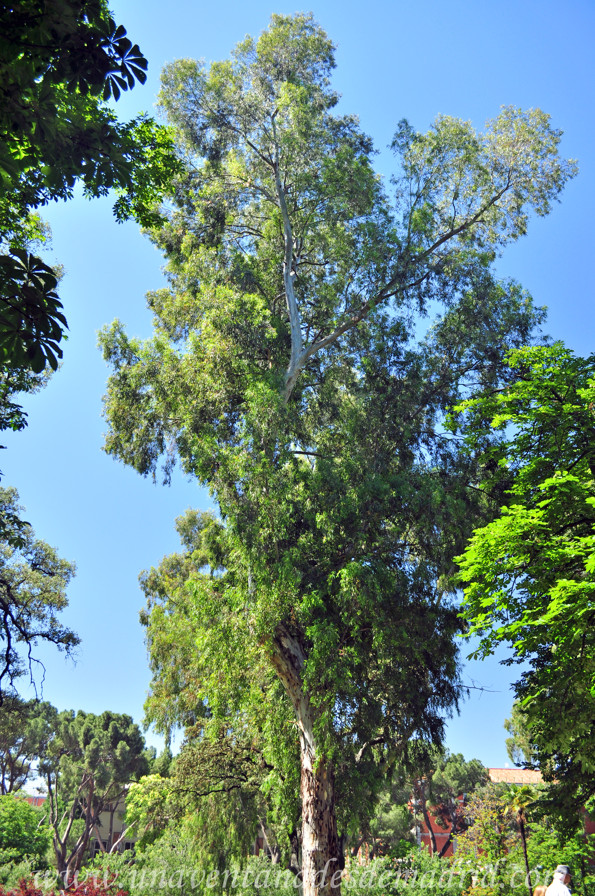 El último árbol que veremos en este tramo es el número 17, el Eucalipto rojo (Eucalyptus camaldulensis), originario de Australia, pero que hoy día se planta en diferentes zonas del mundo, incluyendo la Península Ibérica, algo que a veces ha conllevado el empobrecimiento del suelo. Fue descrito por primera vez en un catálogo de un monasterio de la Orden de la Camáldula que se encontraba cerca de Nápoles (Italia). De gran altura y porte, llega fácilmente a los 20 metros de altura, alcanzando en ocasiones incluso los 60 metros. Tiene la particularidad de que sus ramas pueden caer sin previo aviso (desrame), favoreciendo con ello el ahorro de agua, lo cual ha hecho que reciba el nombre de "Hacedor de viudas", por lo que conviene tener cuidado al pasar cerca de él. De madera quebradiza, quizás por ese menor consumo de agua, es un árbol muy utilizado en la producción de papel, así como de distintos productos medicinales e industriales. En El Retiro, se pueden ver numerosos eucaliptos repartidos por todo el parque. Podéis leer todas las características en el reportaje publicado sobre la Senda 2, o entrando en este enlace.