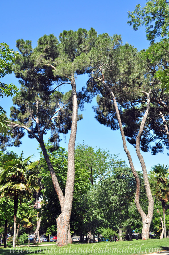 Ya en la zona que ocupó el antiguo cementerio en tiempos de Carlos III, veremos el Pino piñonero (Pinus pinea), o pino real, con el número 15 en la senda. Se trata de una conífera que procede de la región mediterránea y que fácilmente puede llegar a los 500 años de vida. Tiene un gran porte y altura, alcanzando en ocasiones hasta los 30 metros de alto y quedando coronado por una copa redondeada en forma de parasol y de una gran frondosidad. Los frutos germinan a finales de verano y comienzos de otoño, permaneciendo en el árbol las piñas hasta que han madurado completamente, lo cual ocurre ya en la primavera del cuarto año, momento en que se abren y se caen los piñones, los de mayor tamaño de todos los pinos ibéricos. Desde hace siglos, éstos han sido ampliamente utilizados en gastronomía, existiendo actualmente en Castilla y León una importante industria alrededor de este fruto. En el parque, hay más de 600 pinos piñoneros que, o bien no guardan un orden específico, o bien forman alineaciones unos con otros, destacando el paisaje que dibujan en la zona en la que estamos, así como en los Jardines de Cecilio Rodríguez; también aparecen frente al Palacio de Velázquez, en el Paseo de Coches y alrededor de la Fuente de la Alcachofa. Para conocer las características completas de estos árboles, podéis leer el artículo publicado sobre ellos en el reportaje sobre la Senda 2, o siguiendo este enlace.