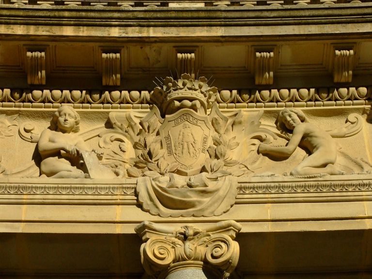 "El hemiciclo5 en su doble columnata6, representa a la nación española con todas sus provincias, cuyos escudos campean en el cornisamento7 y sobre los ejes de las columnas, alternando con las cifras de A. XII.