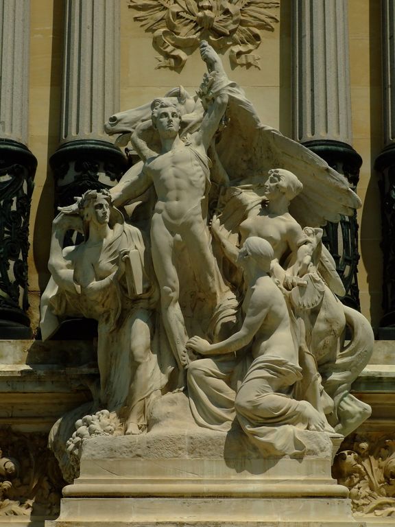 Los cuatro pilarotes de los extremos se hallan enriquecidos con grupos escultóricos y bajo relieves, representativos de las fuerzas vivas del país, la Agricultura, la Industria, el Ejército, la Marina, las Ciencias y las Artes, y rematan con cúpulas que sostienen las figuras de la Fama y de la Gloria.