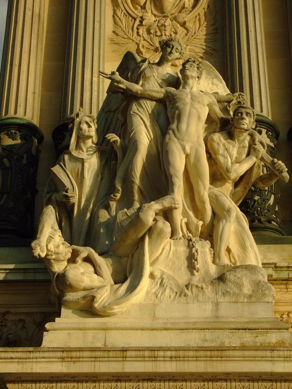 Sobre el relieve La Instauración Monárquica, el primero que vimos, y a la misma altura que La Libertad, se sitúa el tercer grupo escultórico, El Progreso, realizado por Miguel Ángel Trilles, natural de Madrid y mismo escultor que añadió unas figuras de niños a la Fuente de Cibeles.
