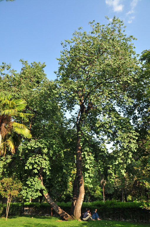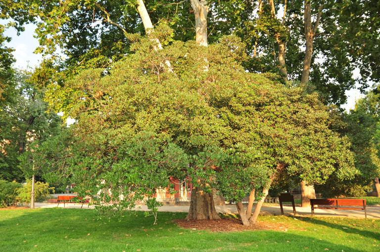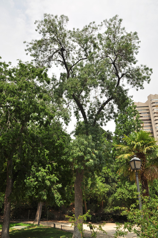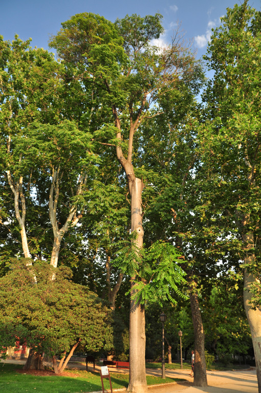 El ailanto que vemos en la fotografía es uno de los más altos y gruesos que hay en El Retiro. Además, es posible encontrar más ejemplares en el Jardín de los Planteles, en el Campo Grande y en los jardines que hay entre el Bosque del Recuerdo y el Parterre.