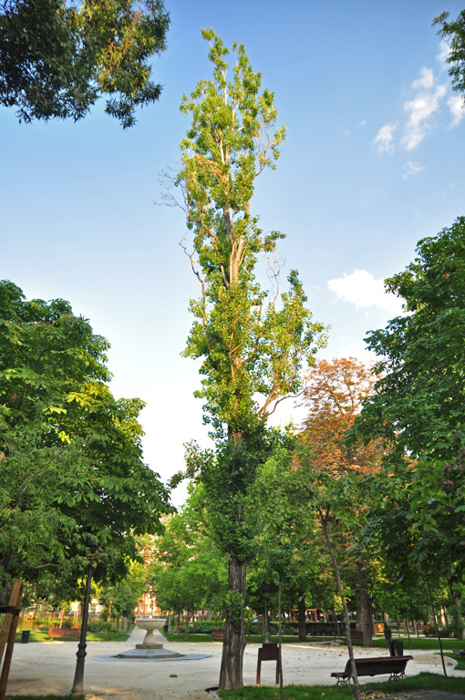 En el parque, la mayor zona donde se pueden encontrar álamos negros es ésta en la que estamos. Asimismo, también los veremos en los jardines que hay entre la Puerta de la Independencia y el Paseo de las Estatuas.