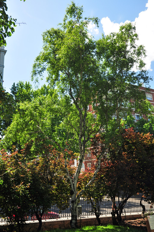 En todo el parque, sólo hay dos ejemplares de abedul: uno se encuentra en la parte Norte de la Ría de Patinar, mientras que el otro es que mostramos en la fotografía, el cual está ubicado entre la vegetación del pequeño estanque que hay en esta zona del Jardín de Vivaces.