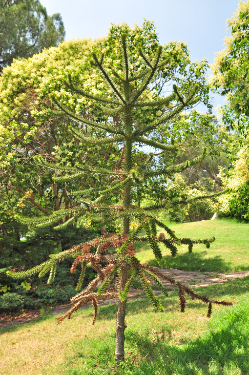 A continuación nos encontramos la Araucaria (35) (Araucaria araucana), especie cuyo origen lo tenemos en el Sur de la Cordillera de los Antes (Chile y Argentina), conociéndose su existencia hace ya 200 millones de años, durante le Era Mesozoica53. La araucaria es también conocida como Araucaria chilena, Pino de Chile, Araucaria de Neuquén, o Peuhén, entre otros nombres.