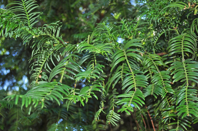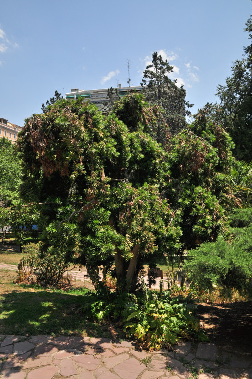 Rodeamos la Rosaleda por su parte exterior hasta llegar al Cefalotejo (25) (Cephalotaxus harringtonia), especie originaria de China y Japón también conocida como Bruno chino, o Tejo de Hokkaido, y cuyo nombre científico proviene del griego "kephale", que significa "cabeza", refiriéndose con ello a que en los árboles masculinos las flores aparecen agrupadas formando ramos redondeados que quedan unidos a las hojas a través de un pedúnculo, o "cuello". Por su parte, "taxus" significa "tejo", aludiendo así al parecido que tienen las hojas de esta especie con las del cefalotejo.