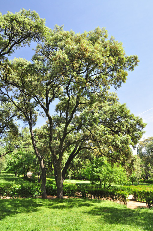 Continuamos nuestra subida y llegaremos hasta el siguiente punto: la Encina (27) (Quercus ilex), proveniente de la región mediterránea y también conocida popularmente como carrasca. Cuando se crea el Jardín del Buen Retiro, se hace sobre unos terrenos ya cultivados y de monte en los cuales aún sobrevivían algunas encinas de las tantas que poblaron los alrededores de Madrid tiempo atrás. Es por esto que se cree que las encinas ante las que nos encontramos aquí podrían descender de aquellas otras. Sin embargo, lo más probable es que las actuales hubieran sido plantadas, ya en el siglo XX, en el momento en que se ajardinó esta zona de El Retiro.