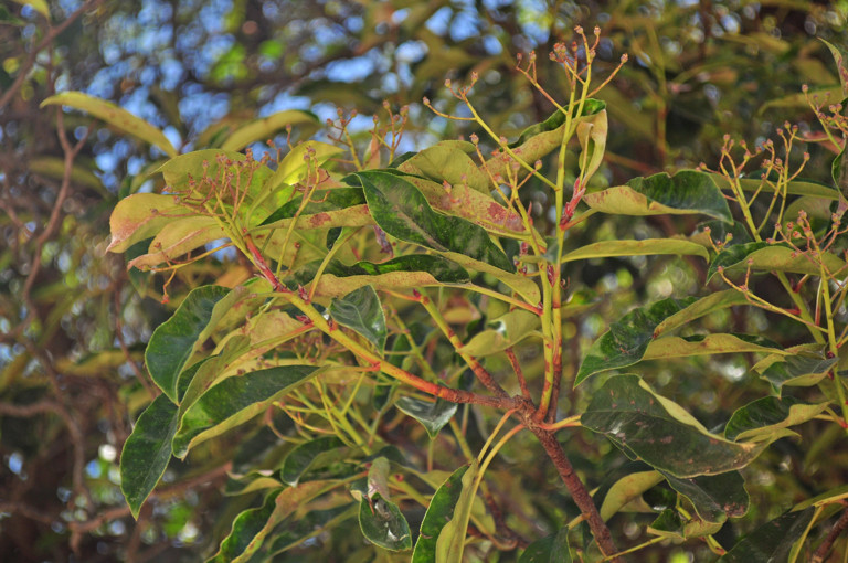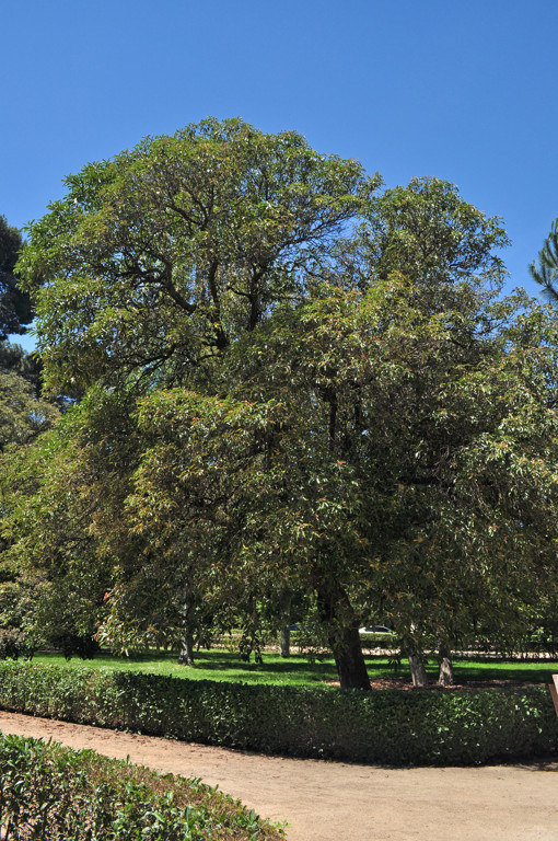 Estamos ante un árbol de grandes dimensiones, pues puede alcanzar una altura de unos 40 metros, si bien los que vemos en el Jardín de Vivaces son más bien arbustos de gran tamaño. El tronco posee una corteza de tono grisáceo que se va desprendiendo en tiras con el paso del tiempo, mientras que la copa, como podemos comprobar en la fotografía, está muy ramificada. Sus hojas son perennes, de forma alargada (entre 10 y 15 centímetros) y acabadas en punta, bastante gruesas al tacto y de un color verde oscuro en el haz y verde amarillento en el envés. Se trata de una especie dioica44, floreciendo, en torno a mayo y/o junio, en pies distintos las flores masculinas y las femeninas; mientras que las primeras se desarrollan agrupadas y poseen un color amarillo verdoso, las segundas son marrones y crecen solitarias. Los frutos germinan alrededor de julio, madurando en el árbol hasta febrero del año siguiente.
