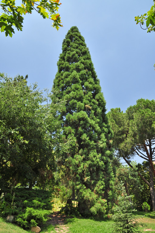 No muy lejos, tenemos la Secuoya gigante (33) (Sequoiadendron giganteum), o árbol de mamut, cuyo origen está en el Norte de California. Fue descubierta en 1831 por dos botánicos y enviada a Londres en 1853, extendiéndose ya por el resto de Europa. Son ejemplares muy longevos, pudiendo a llegar a vivir más de 2.000 años. En la actualidad, el árbol con mayor volumen del mundo es una secuoya gigante que se conoce con el nombre de "General Sherman" y que se encuentra en California; tiene 83,8 metros de alto, 11 metros de diámetro en la base y 31 metros de perímetro, y pesa unas 1.400 toneladas. Por lo que respecta a España, hay secuoyas en prácticamente todas las provincias, si bien destacan las que podemos encontrar en Segovia.
