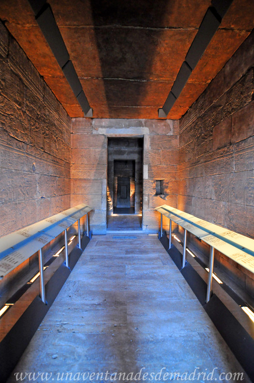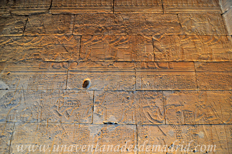 De aquí, nos trasladamos al otro extremo del vestíbulo, donde en su muro Sur hay una puerta que nos lleva a una de las estancias que más caracteriza a un templo de este tipo: el Mammisi, una sala de planta rectangular construida de forma perpendicular al resto del edificio.
