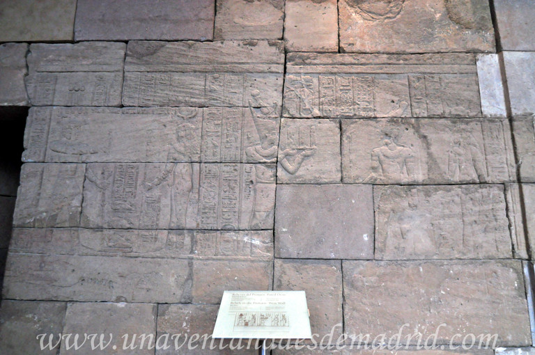 Los relieves interiores de esta parte de la fachada los detallaremos más adelante, al hablar del vestíbulo. En el exterior, el protagonista era el emperador Augusto, quien estaba representado, de izquierda a derecha, adorando al dios Amón, ofreciendo la diosa Maat al dios Osiris, ofreciendo un vaso a la diosa Isis y, por último, presentándose ante el dios Mahesa.