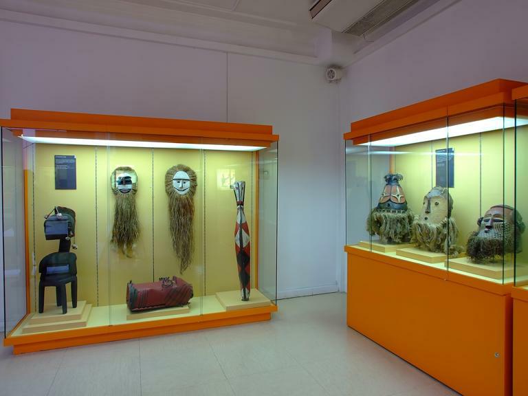 Una segunda sección será la dedicada a la Música y las Actividades Lúdicas. En África, la música siempre ha servido para transmitir conocimientos y celebrar acontecimientos. Por un lado, está la música con fines lúdicos y, por otro, la música ritual, interpretada en ritos de iniciación; los instrumentos usados aquí son los tambores, los sonajeros, o las campanas de hierro, siendo estos dos últimos utilizados para marcar las pausas a los tambores y que podremos ver en las diferentes vitrinas. Sobre las actividades lúdicas, éstas se han convertido en un complemento de la vida diaria. Hoy día, se pueden encontrar juguetes realizados con materiales reciclados, como cochecitos de lata o escopetas de palo, por ejemplo. Por otro lado, el tiempo libre también suele utilizarse para el consumo de drogas, como el tabaco y el cannabis28, o las tradicionales "kola" (África occidental) y "khat" (África oriental). Todas tienen una función estimulante, social, ritual o, incluso, medicinal y su consumo está regido por normas que dictan quiénes pueden tomarlas y cuándo. Relacionado con todo ello, podremos ver varias pipas y útiles usados por los fumadores, así como muñecos y otros juguetes usados por los niños.