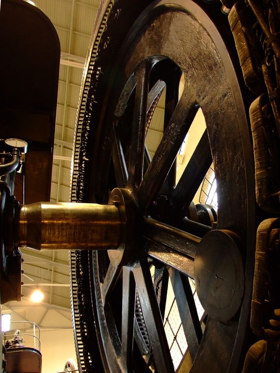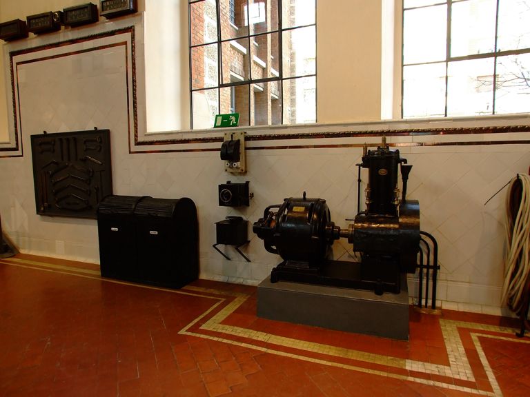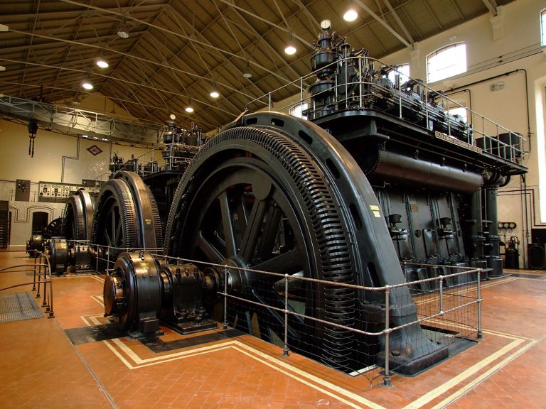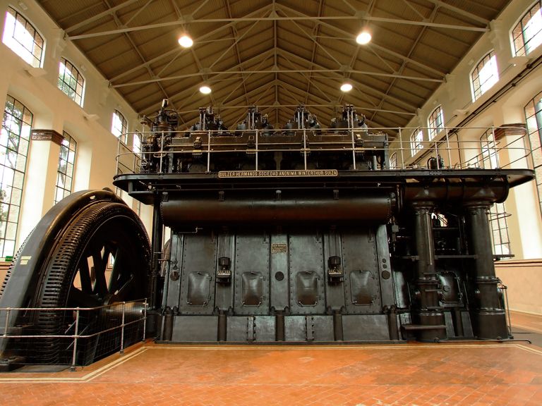 Tras ver el vídeo de la sala de acogida, pasamos a la Nave de Motores, de planta rectangular y unas medidas de 44,2 metros de largo por 17,5 metros de ancho, variando la altura de los muros desde los 12 metros del perímetro a los 16 de su parte más alta. Una vez traspasadas las puertas de entrada, lo primero que veremos enfrente de nosotros será esta enorme mole de hierro y bronce que vemos en la fotografía de nuestra derecha. Es un motor diesel de cuatro cilindros y dos tiempos de la marca Sulzer Frères, S.A., empresa situada en la localidad suiza de Winterthur y aún existente en la actualidad.