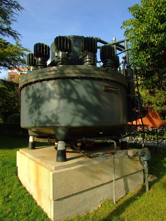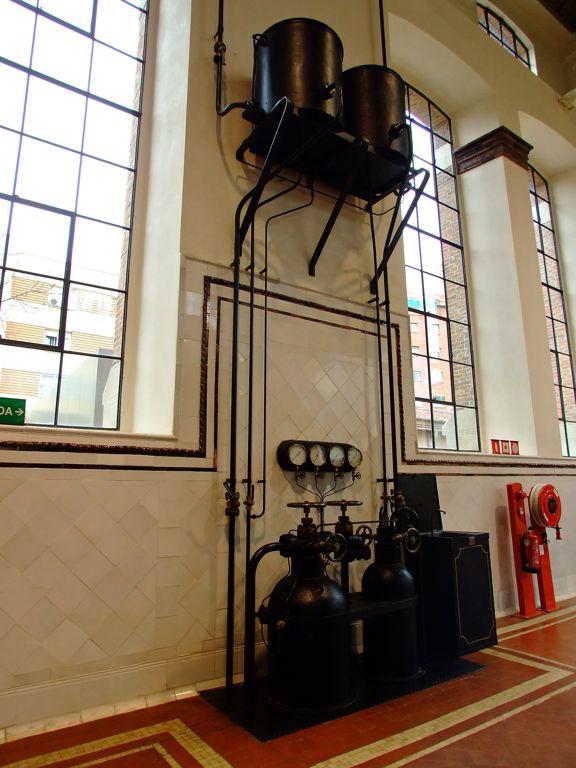 Este era el rectificador9 estático de vapor de mercurio de la marca Brown Boveri, utilizado inicialmente en la Nave de Motores para convertir la corriente alterna en continua. Una vez demostrada la peligrosidad del trabajo con mercurio dada su alta toxicidad, especialmente si es en forma de vapores de mercurio por la mayor facilidad de absorción de éste, se instalaron las conmutatrices que hemos visto anteriormente.