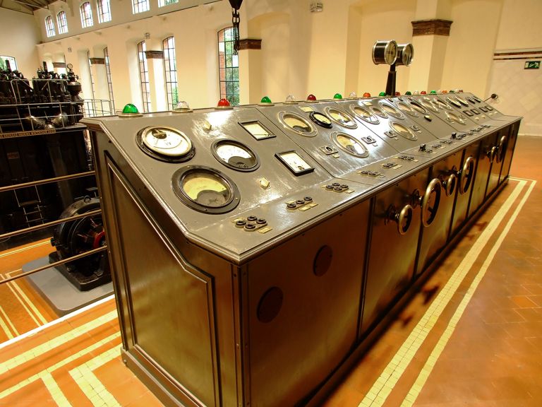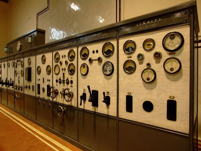 Desde este panel se gestionaba el funcionamiento de la central, tanto de los motores como de la electricidad, bien producida o transformada, dividiéndose para ellos en las dos partes que veremos a continuación: los pupitres y los paneles.