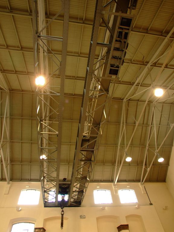 Los motores llegaron a la nave desarmados y, para su montaje y solventar las posibles reparaciones o sustituciones de piezas que fueran necesarias posteriormente, se instaló un puente-grúa eléctrico que vemos en la fotografía de la izquierda y que, con una capacidad de carga de hasta 12.000 kilogramos, se podía desplazar a lo largo de toda la nave.